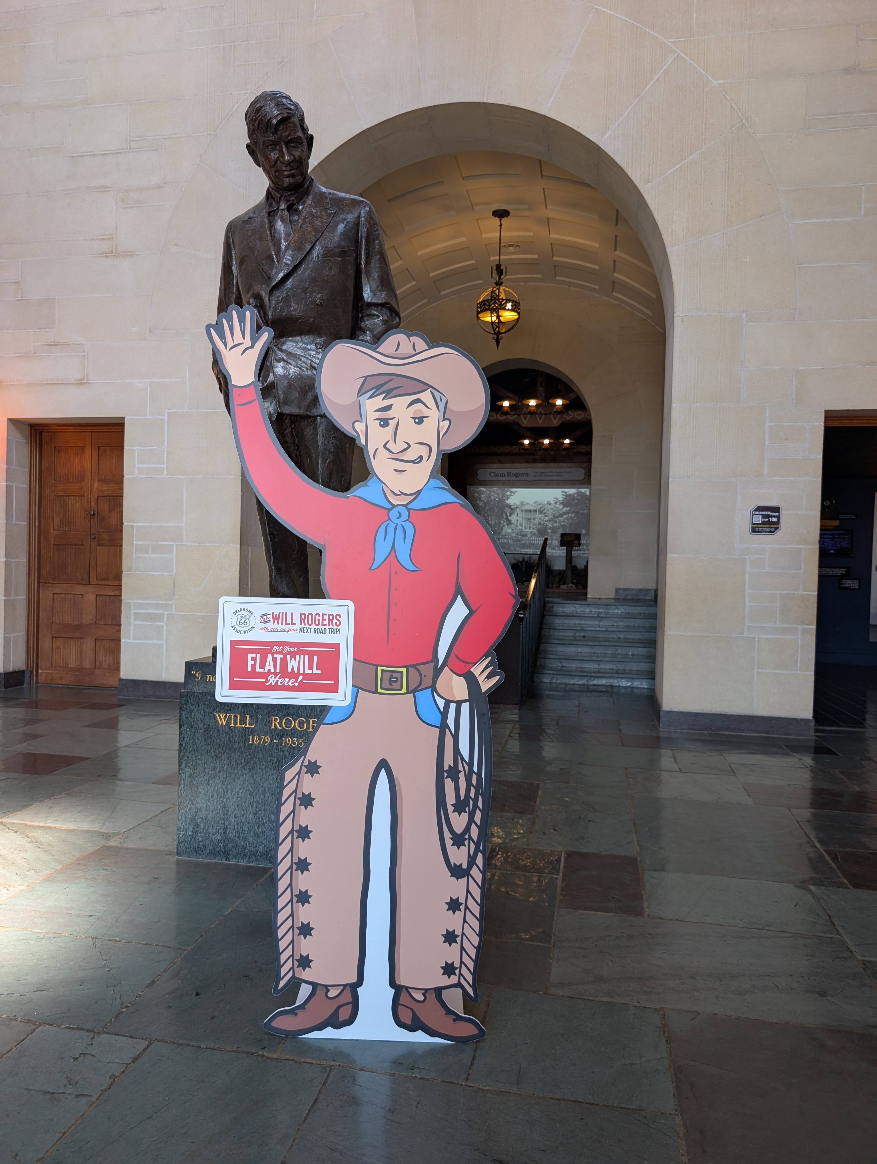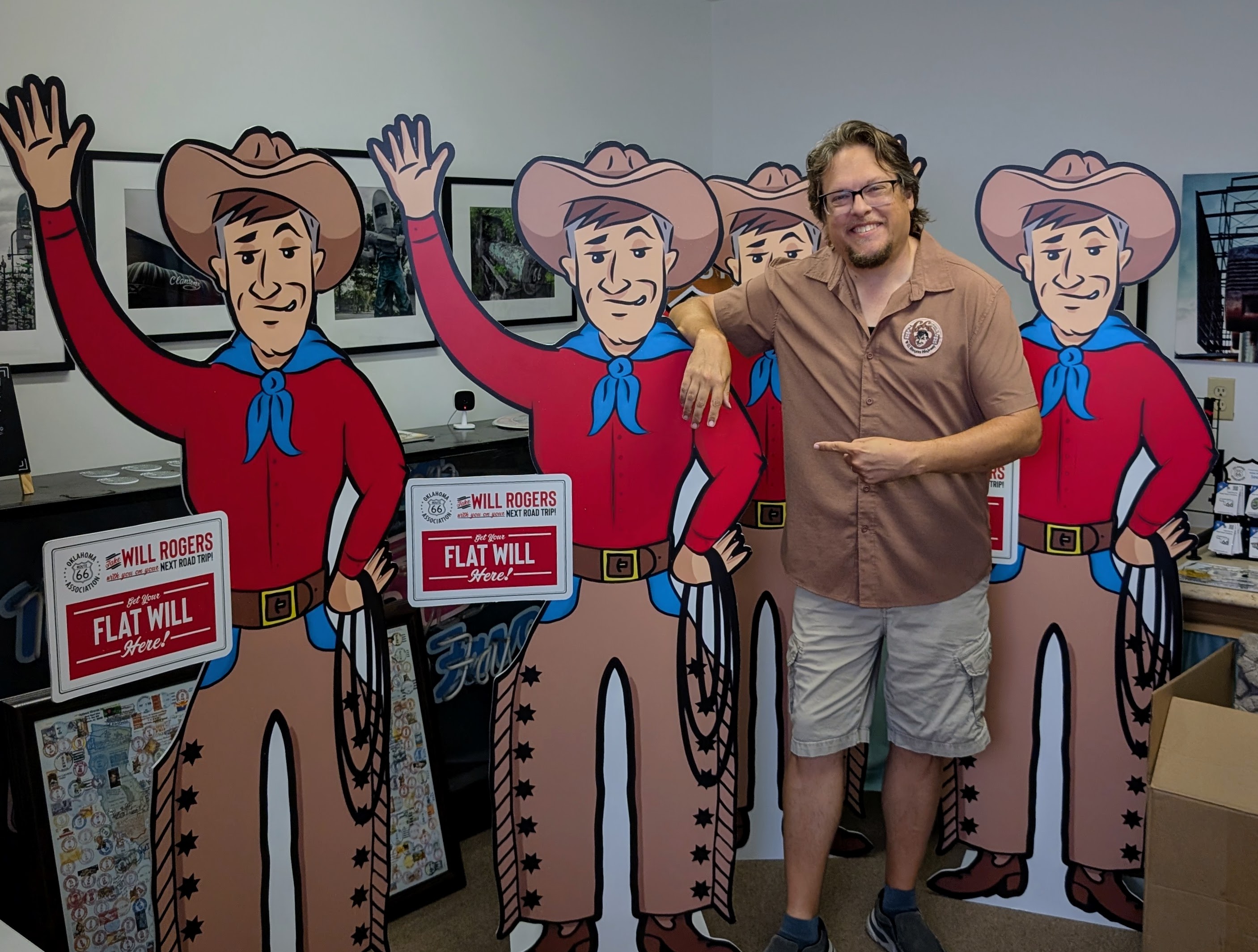 More than two years ago, I had an idea. I’d heard of Flat Stanley and I had taken my own Flat Golden Driller and Flat Buck Atom with me on road trips. The 2026 Centennial of Route 66 already felt impossibly close and I thought: what better way to keep Will Rogers in the conversation than send out a ton of little cartoon Wills for people to enjoy on their own travels? Sam thought it was a great idea and that’s all I needed to get going.