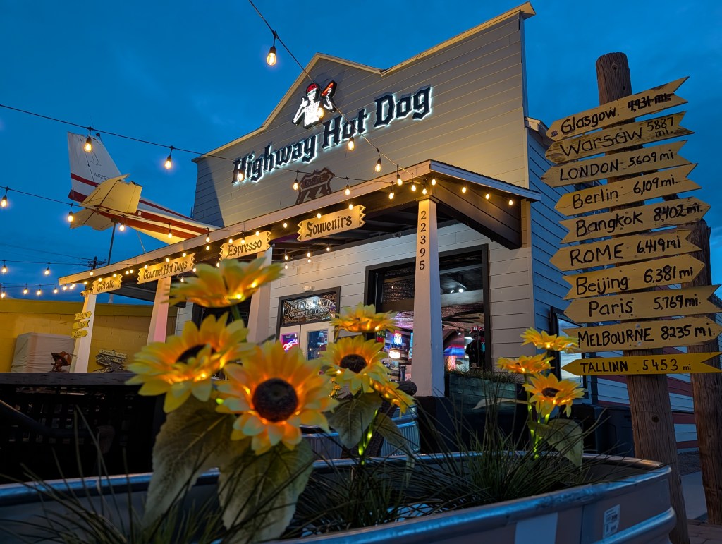 Thanks to the time I spent in the area earlier this year on the Osterman Station project, the drive from Kingman to Seligman has become very familiar. Although Samantha had been down the road here before, it wasn’t at a pace that would allow for true saturation like this time around. We stopped at Antares Point and visited with a kind shopkeeper there; I showed her all of the progress at the Osterman Station with restoration still underway; we enjoyed a terrific meal at Westside Lilo’s (another recent recipient of the Preserve Route 66 Legacy Business Grant.) I was also happy to see that the former Seligman Sundries building renovation was completed and a new restaurant, Highway Hot Dog, is now open.